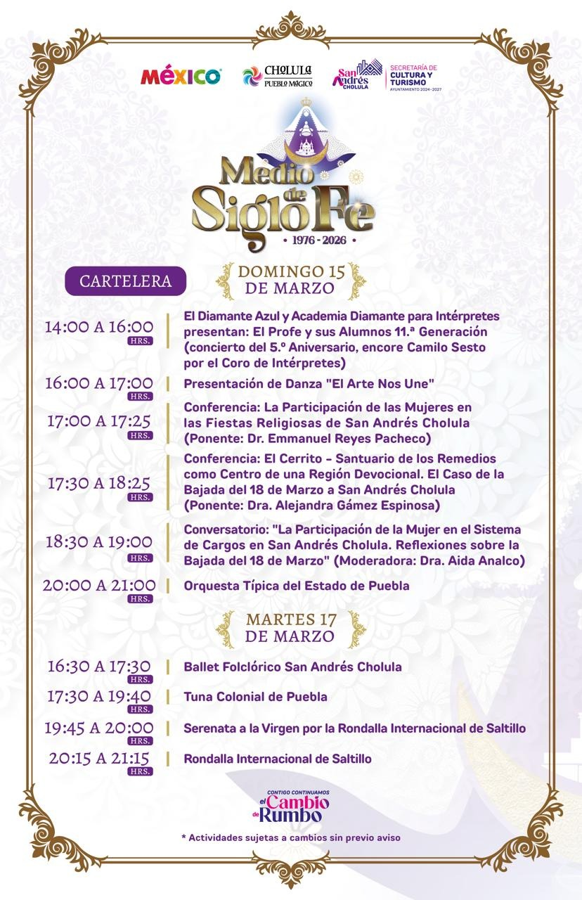 La celebración continúa con una gran cartelera cultural llena de música, danza y tradición en San Andrés Cholula. Vive dos días especiales donde la fe y la cultura se unen para conmemorar 50 años de historia y devoción.